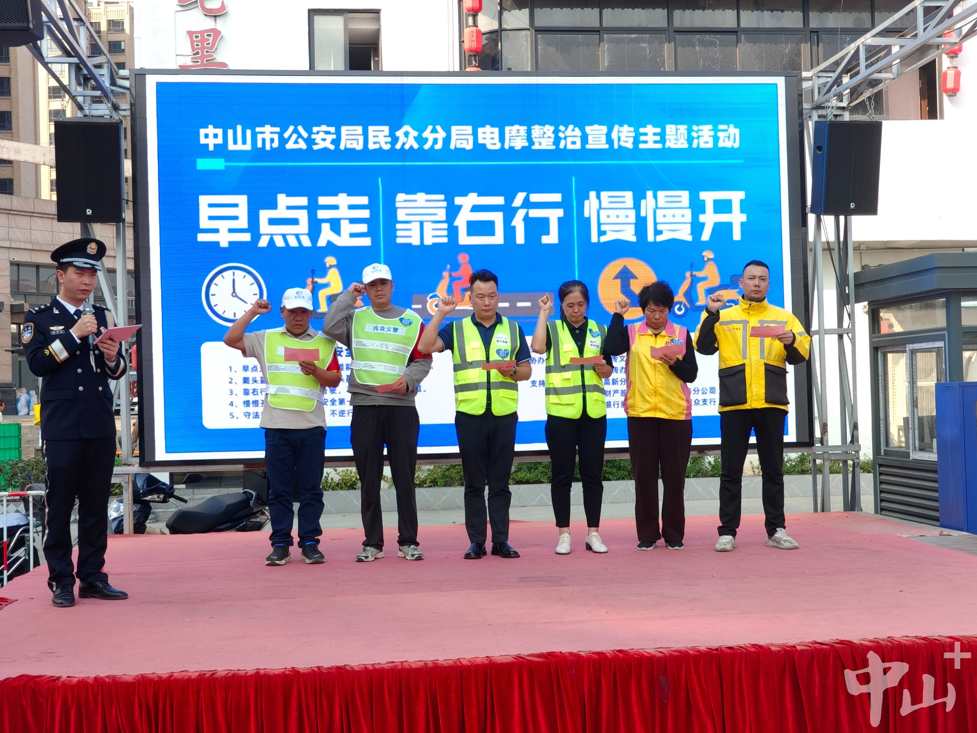 “我自愿踐行‘早點走、靠右行、慢慢開’九字訣,嚴(yán)格遵守交通法規(guī),正確佩戴安全頭盔,爭當(dāng)文明騎乘人……”1月19日下午,中山市民眾街道“踐行九字訣 平安伴我行”電動自行車、摩托車交通安全宣傳活動現(xiàn)場,來自轄區(qū)不同村居、行業(yè)的代表莊嚴(yán)宣誓,正式拉開了這場全民參與的安全宣傳活動序幕。