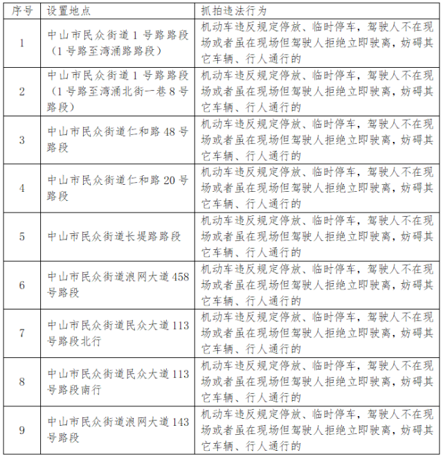 據(jù)“民眾發(fā)布”微信公眾號消息,為進(jìn)一步維護(hù)道路交通秩序,預(yù)防和減少交通事故的發(fā)生,交警部門在中山市民眾街道增設(shè)了9處固定式交通技術(shù)監(jiān)控設(shè)備,現(xiàn)將設(shè)置地點(diǎn)向社會公布。