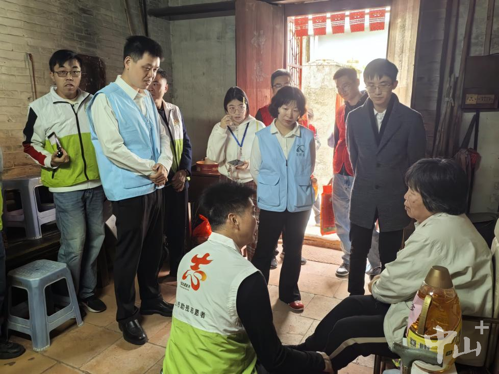 義診結(jié)束后,志愿者前往樂(lè)群村開(kāi)展入戶慰問(wèn)?!安唐牌藕?,我們帶了油、米、牛奶來(lái)看望您?!敝驹刚吆榻饕贿厗?wèn)候,一邊將慰問(wèn)品送到蔡婆婆手中。因腦梗導(dǎo)致半身行動(dòng)不便的蔡婆婆,和志愿者嘮著家常,分享自己的身體近況與生活日常。志愿者耐心寬慰,鼓勵(lì)她以樂(lè)觀心態(tài)積極生活,現(xiàn)場(chǎng)溫馨暖心的交流氛圍,讓人感動(dòng)。