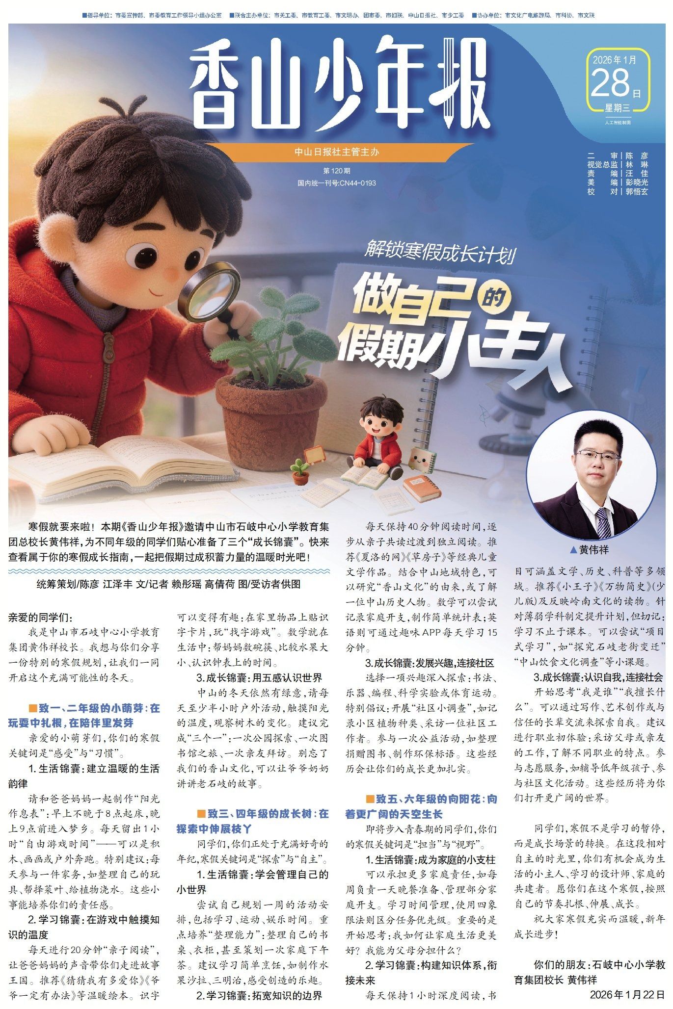 寒假就要來啦!中山市石岐中心小學教育集團總校長黃偉祥為不同年級的同學們貼心準備了三個“成長錦囊”。快來查看屬于你的寒假成長指南,一起把假期過成積蓄力量的溫暖時光吧!(→點擊查看詳情)