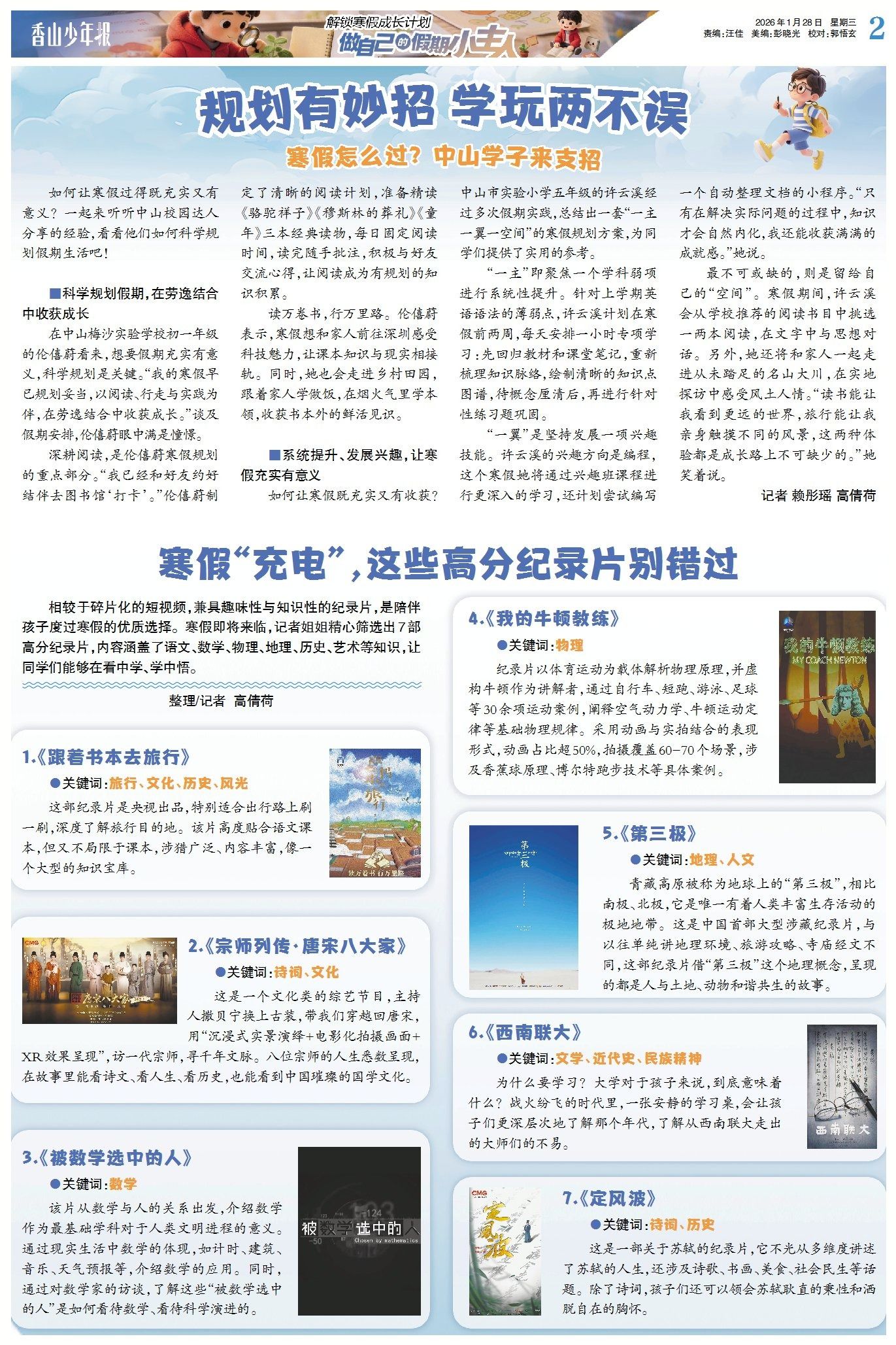 如何讓寒假過得既充實又有意義?一起來聽聽中山校園達人分享的經(jīng)驗,看看他們?nèi)绾慰茖W規(guī)劃假期生活吧!此外,記者姐姐精心篩選出7部高分紀錄片,內(nèi)容涵蓋了語文、數(shù)學、物理、地理、歷史、藝術(shù)等知識,讓同學們能夠在看中學、學中悟。(→點擊查看詳情)