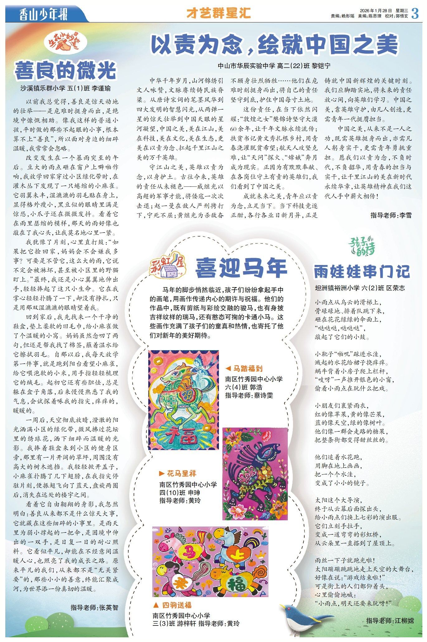 本期《才藝群星匯》,有同學用文字呼吁青年傳承英雄精神,用實干延續(xù)中國之美,讓英雄精神薪火相傳;有同學感悟善良藏于點滴善意,平凡之舉亦能溫暖人心、照亮成長;還有同學用詩句表達出對雨天美好時光的眷戀與期盼,滿是童真童趣。彩虹屋里,孩子們紛紛拿起手中的畫筆,用畫作傳遞內(nèi)心對馬年的期許與祝福。(→點擊查看詳情)