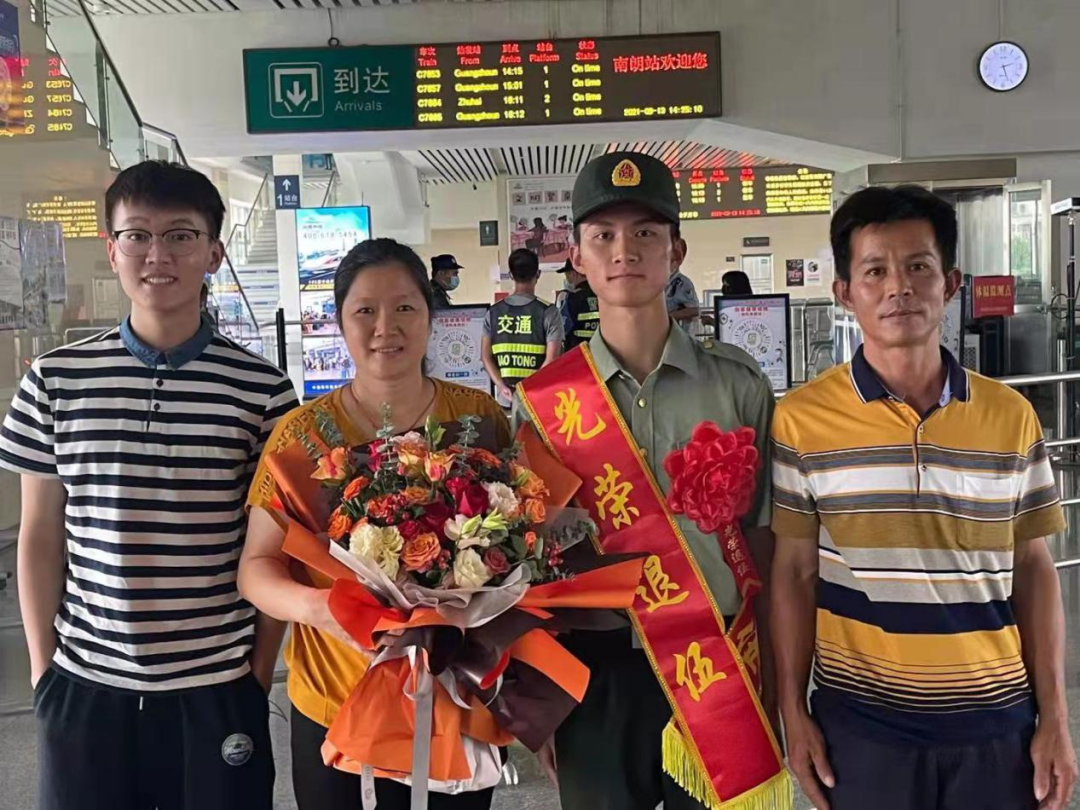 “去時(shí)鑼鼓喧天,歸來(lái)夾道歡迎。” 九月,正是退役軍人 從祖國(guó)各座軍營(yíng) 返回家鄉(xiāng)的退役季 為營(yíng)造“一次參軍、一生光榮”的濃厚氛圍 讓退役軍人感受到家鄉(xiāng)人民的熱情和關(guān)懷 激發(fā)老兵退伍不褪色 返鄉(xiāng)建新功的壯志熱情 9月13日下午,五桂山街道2021年首位退役軍人曾世紀(jì)光榮退役返鄉(xiāng)。街道退役軍人服務(wù)中心負(fù)責(zé)人、社區(qū)“兩委”干部、工作人員以及曾世紀(jì)的父母早早手持鮮花,在城軌南朗站等候迎接世紀(jì)回家。 回想2019入伍歡送大會(huì)時(shí)曾世紀(jì)代表五桂山即將入伍的新兵作表態(tài)發(fā)言,那年,他主動(dòng)請(qǐng)纓,到艱苦邊遠(yuǎn)地區(qū)服役?!皡④姴粌H是個(gè)人的榮耀,也是家人的榮耀,更是鄉(xiāng)親們的榮耀。到了部隊(duì)后我會(huì)堅(jiān)決服從命令,聽(tīng)從指揮,刻苦訓(xùn)練,勤學(xué)本領(lǐng),絕不辜負(fù)家鄉(xiāng)人民的期望!”