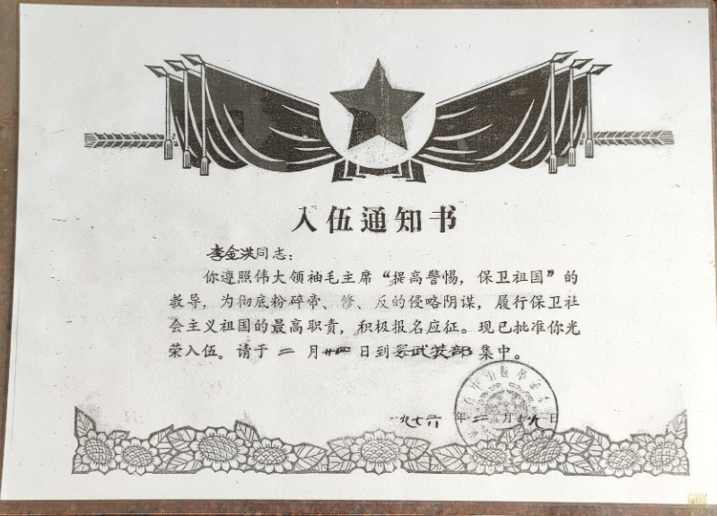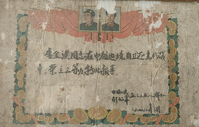 1976年2月,李金洪(第一排右二)春季應(yīng)征入伍大合照 炮火洗禮,浴血奮戰(zhàn) 1979年2月17日,天還未亮,中越邊境線上萬(wàn)炮齊發(fā),漆黑的天空霎時(shí)被炮火染紅。震耳欲聾的炮火聲、沖鋒陷陣的吶喊聲如同驚雷般在李金洪耳邊炸響,令他熱血沸騰,一片空白的腦海瞬間被浴血?dú)?、奪取勝利的斗志填滿。 這是李金洪作為53258部隊(duì)尖刀班機(jī)槍手參加1979年對(duì)越自衛(wèi)反擊戰(zhàn)的記憶。當(dāng)時(shí),尖刀班肩負(fù)著沖在隊(duì)伍最前方、為主力部隊(duì)擋下槍炮等最為急難險(xiǎn)重的任務(wù)。 從2月17日到3月16日,從靠松山到三埡口,在持續(xù)一個(gè)月的山地戰(zhàn)爭(zhēng)中,李金洪和戰(zhàn)友們每天僅靠吃干糧野果、喝河水充饑,整整一個(gè)月的時(shí)間里衣服干了又濕,濕了又干,有時(shí)受傷之后,傷口和衣服都粘在一起,疼痛無(wú)比。當(dāng)時(shí)雖然又累又困,但是戰(zhàn)士們的眼睛始終都是保持睜開(kāi)的,因?yàn)閿橙穗S時(shí)都會(huì)出現(xiàn)在附近,瞬間就是你死我活的戰(zhàn)場(chǎng)。就這樣,李金洪一直以堅(jiān)定信念和頑強(qiáng)精神在戰(zhàn)場(chǎng)殺敵,直到戰(zhàn)爭(zhēng)結(jié)束。 生死一瞬間,火線立軍功 1979年3月10日,尖刀班接到了去三埡口搜山的任務(wù),突然與敵軍遭遇,當(dāng)時(shí)尖刀班只配備了一挺機(jī)槍,而李金洪就是機(jī)槍手,當(dāng)時(shí)由于地形對(duì)我方不利,不便發(fā)動(dòng)火力打擊和進(jìn)行蔭蔽工作。這時(shí),班長(zhǎng)一邊指揮2名戰(zhàn)士立即下山給后方的大部隊(duì)報(bào)信,一邊組織全班沉著埋伏,等待敵人靠近。 當(dāng)敵人離陣地只有幾米時(shí),作為班里唯一機(jī)槍手的李金洪突然挺起機(jī)槍準(zhǔn)備開(kāi)火,敵軍看到機(jī)槍慌亂朝他射擊,李金洪迅速閃躲,避開(kāi)飛來(lái)的子彈,隨即向敵人開(kāi)火,首發(fā)即擊斃領(lǐng)頭敵軍,并成功搶占有利地形,用猛烈的火力掩護(hù)全班戰(zhàn)斗,敵人四處逃竄。 僅用半小時(shí),尖刀班就消滅了4名敵人、俘虜1名,繳獲半自動(dòng)步槍2支,并且全班無(wú)一人員傷亡,打下一場(chǎng)漂亮的伏擊戰(zhàn)??克缮?、東溪、高平、茶靈、廣淵、下瑯……對(duì)越自衛(wèi)反擊戰(zhàn)期間,李金洪保家衛(wèi)國(guó)浴血奮戰(zhàn),出色地完成了上級(jí)交給的護(hù)衛(wèi)和戰(zhàn)斗任務(wù),榮立個(gè)人三等功1次。
