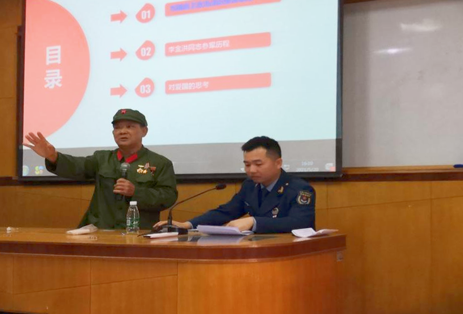 戰(zhàn)后李金洪(第四排左四)與全連戰(zhàn)友合影 愛(ài)國(guó)主義教育的紅旗志愿者 無(wú)論是在戰(zhàn)場(chǎng)上還是在和平年代,無(wú)論是身在部隊(duì)還是脫下軍裝,李金洪都始終保持著軍人的作風(fēng),也始終堅(jiān)守著忠于祖國(guó)、熱愛(ài)人民的精神信仰。李金洪不忘初心、牢記使命,用實(shí)際行動(dòng)詮釋了“退伍不褪色、退役不退志、離軍不離黨”的退役軍人品質(zhì)。 在建黨100周年舉國(guó)同歡的日子里,李金洪受邀參加神灣鎮(zhèn)“老黨員講黨史,憶崢嶸感黨恩”主題活動(dòng)。活動(dòng)上,李金洪以“我和我的祖國(guó)”為題與神灣中學(xué)915名師生共同回憶1979年那段崢嶸歲月,講述了為捍衛(wèi)國(guó)家和人民利益而進(jìn)行的無(wú)畏戰(zhàn)斗,在場(chǎng)師生無(wú)不為之動(dòng)容,深感到今日幸福生活來(lái)之不易。 由于身體患病,李金洪說(shuō)起話來(lái)不是很連貫,甚至不能長(zhǎng)時(shí)間說(shuō)話。但他義無(wú)反顧的接受邀請(qǐng),成為愛(ài)國(guó)主義教育的紅旗志愿者,目的是為了讓年輕一代更加熱愛(ài)祖國(guó)、熱愛(ài)人民和熱愛(ài)生活。