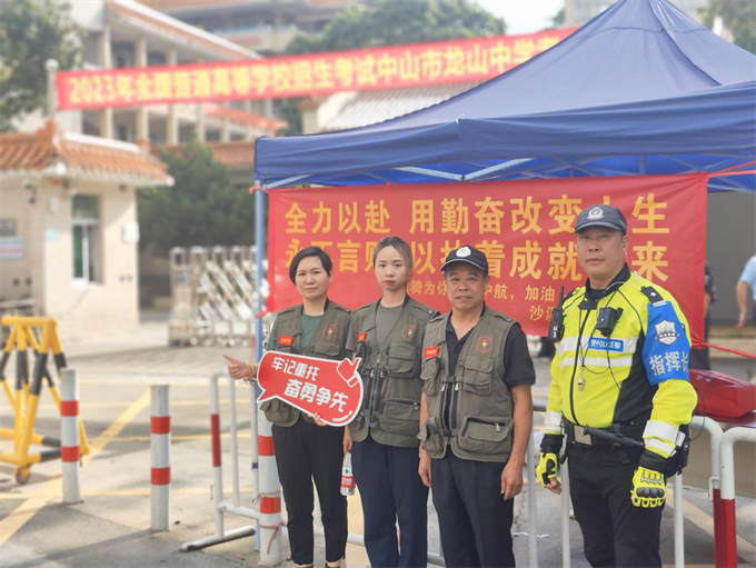 沙溪鎮(zhèn)退役軍人志愿者和民兵協(xié)助公安交警開展高考護(hù)航工作。 7日早上7時(shí)許,在沙溪鎮(zhèn)寶珠東路龍山中學(xué)路口,多名退役軍人紅旗志愿服務(wù)隊(duì)隊(duì)員和民兵協(xié)助公安交警在路口設(shè)立警戒線,做好交通疏導(dǎo)、公共秩序維護(hù)、卡點(diǎn)值守等服務(wù),同時(shí)為考生及家長(zhǎng)提供礦泉水、應(yīng)急救援等服務(wù),給考生營(yíng)造一個(gè)安全、寧?kù)o、有序、文明的考試環(huán)境。 在中山市桂山中學(xué)門口,三鄉(xiāng)鎮(zhèn)退役軍人志愿者和民兵按照事先分工安排,分散在各個(gè)交通路口,有的拉警戒線,有的指揮車輛通行,有的疏散人群,有的負(fù)責(zé)在助力點(diǎn)發(fā)放礦泉水,他們精神抖擻,干勁十足,積極協(xié)助公安民警,做好考場(chǎng)周邊交通秩序維護(hù),確??荚嚻陂g考場(chǎng)周邊環(huán)境安靜有序。