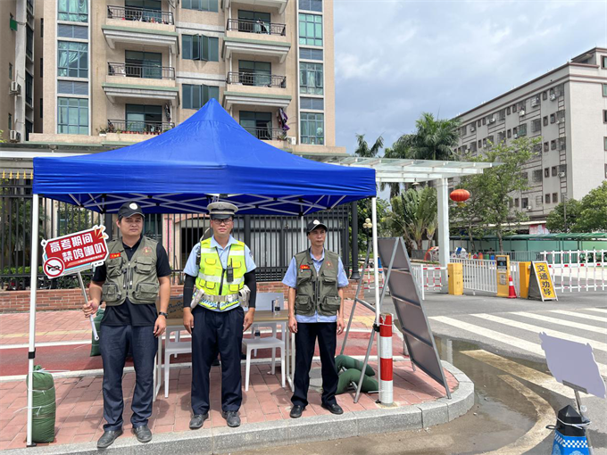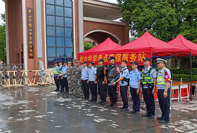 三鄉(xiāng)鎮(zhèn)退役軍人志愿者和民兵在桂山中學(xué)考場(chǎng)提供安保服務(wù)。