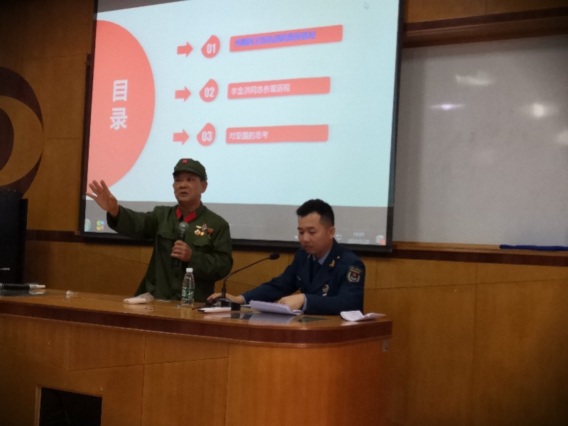 李金洪與陳偉樂(lè)兩代退役軍人同臺(tái)講述崢嶸歲月。 由于身體不適,李金洪無(wú)法長(zhǎng)時(shí)間親述那段崢嶸歲月,但是這位老兵又是那么熱心地想讓更多后輩知道祖國(guó)的不容易,人民當(dāng)今幸福生活的來(lái)之不易,毅然接受邀請(qǐng),克服身體不適,再次走上講臺(tái),結(jié)合親身經(jīng)歷給在場(chǎng)師生講述1979年那段崢嶸歲月。李金洪表示,軍人的使命是保衛(wèi)祖國(guó),抵抗侵略,“如果再給我選擇的機(jī)會(huì),我還是義無(wú)反顧上戰(zhàn)場(chǎng),我們有偉大的共產(chǎn)黨、有偉大的制度、有偉大的祖國(guó)和人民,我們應(yīng)該為自己是一名中國(guó)人和生活在祖國(guó)的大地上感到驕傲和自豪”。 此次宣講活動(dòng)中,李金洪多了一個(gè)戰(zhàn)友,他叫陳偉樂(lè),是駐香港部隊(duì)的退役軍人,也是神灣鎮(zhèn)退役軍人服務(wù)中心的工作人員,李金洪和陳偉樂(lè)雖然是不同時(shí)代的退役軍人,但是有著同一個(gè)方向,就是對(duì)黨、祖國(guó)和人民無(wú)限的愛(ài)。李金洪身體不適,陳偉樂(lè)就來(lái)充當(dāng)他的“傳聲筒”,將一段段難忘經(jīng)歷分享給廣大師生們。