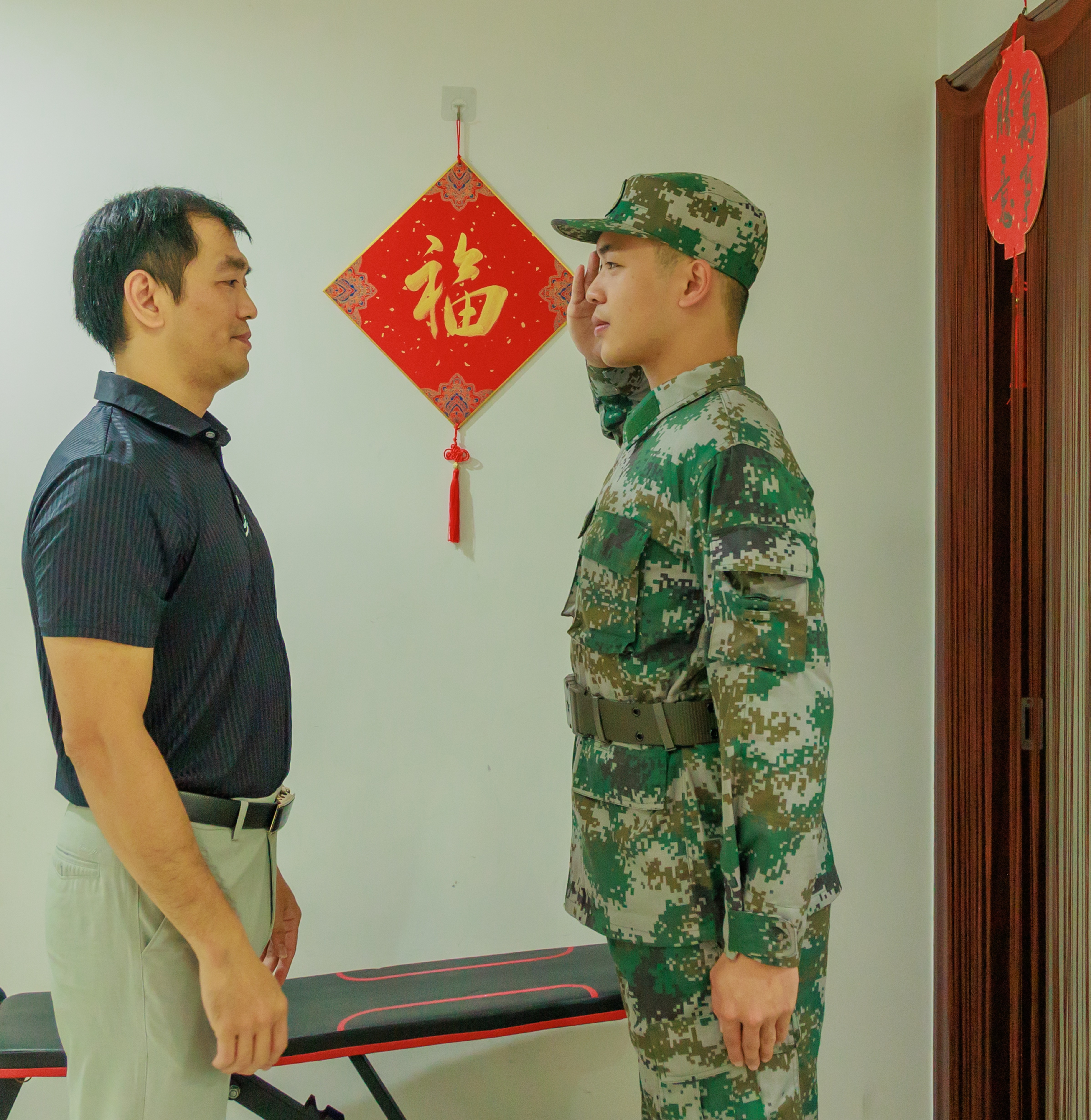 “我將把五彩的夢想交給迷彩去儲藏……”9月8日,中山市東區(qū)街道舉行2023年下半年入伍青年歡送座談會,新兵代表?xiàng)钌辛丶拥卣f。楊尚霖現(xiàn)已領(lǐng)取入伍通知書,并前往中山市國防教育基地開展役前訓(xùn)練,幾天后將啟程前往部隊(duì)服役。 楊尚霖給父親敬禮。馬衛(wèi)星 攝