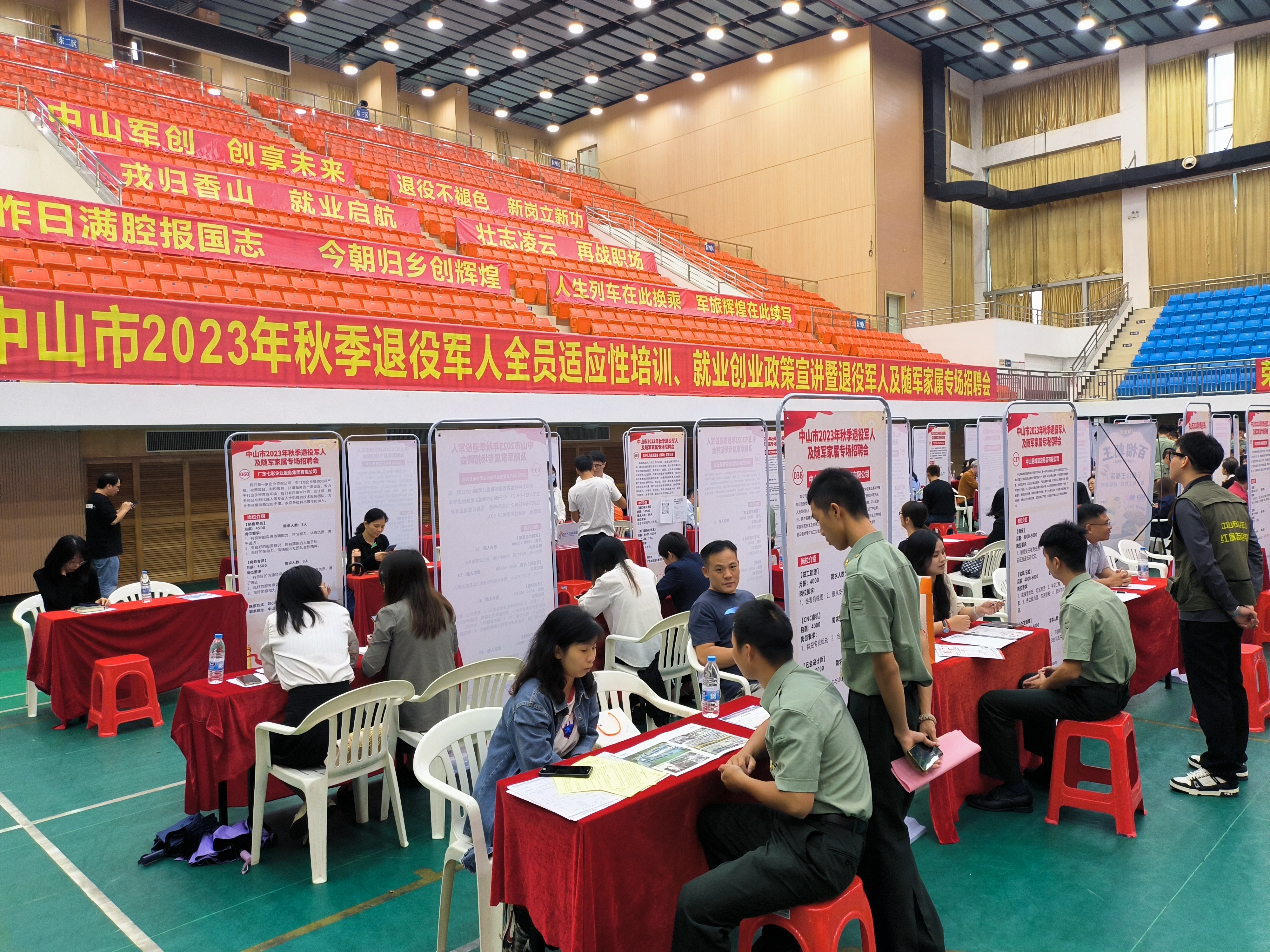 中山市2023年秋季退役軍人及隨軍家屬專場(chǎng)招聘會(huì)現(xiàn)場(chǎng)。(市退役軍人事務(wù)局供圖) 為深入開展“我為群眾辦實(shí)事”實(shí)踐活動(dòng),推動(dòng)主題教育走深走實(shí)、見行見效,10月20日下午,中山市2023年秋季退役軍人及隨軍家屬專場(chǎng)招聘會(huì)在中山火炬職業(yè)技術(shù)學(xué)院體育館成功舉辦。專場(chǎng)招聘會(huì)由中山市退役軍人事務(wù)局主辦,中山火炬職業(yè)技術(shù)學(xué)院、中山市退役軍人服務(wù)中心、各鎮(zhèn)(街)退役軍人服務(wù)中心承辦,中山市才通天下信息科技股份有限公司、中山市退役軍人就業(yè)創(chuàng)業(yè)促進(jìn)會(huì)、中山市愛國(guó)擁軍促進(jìn)會(huì)協(xié)辦。