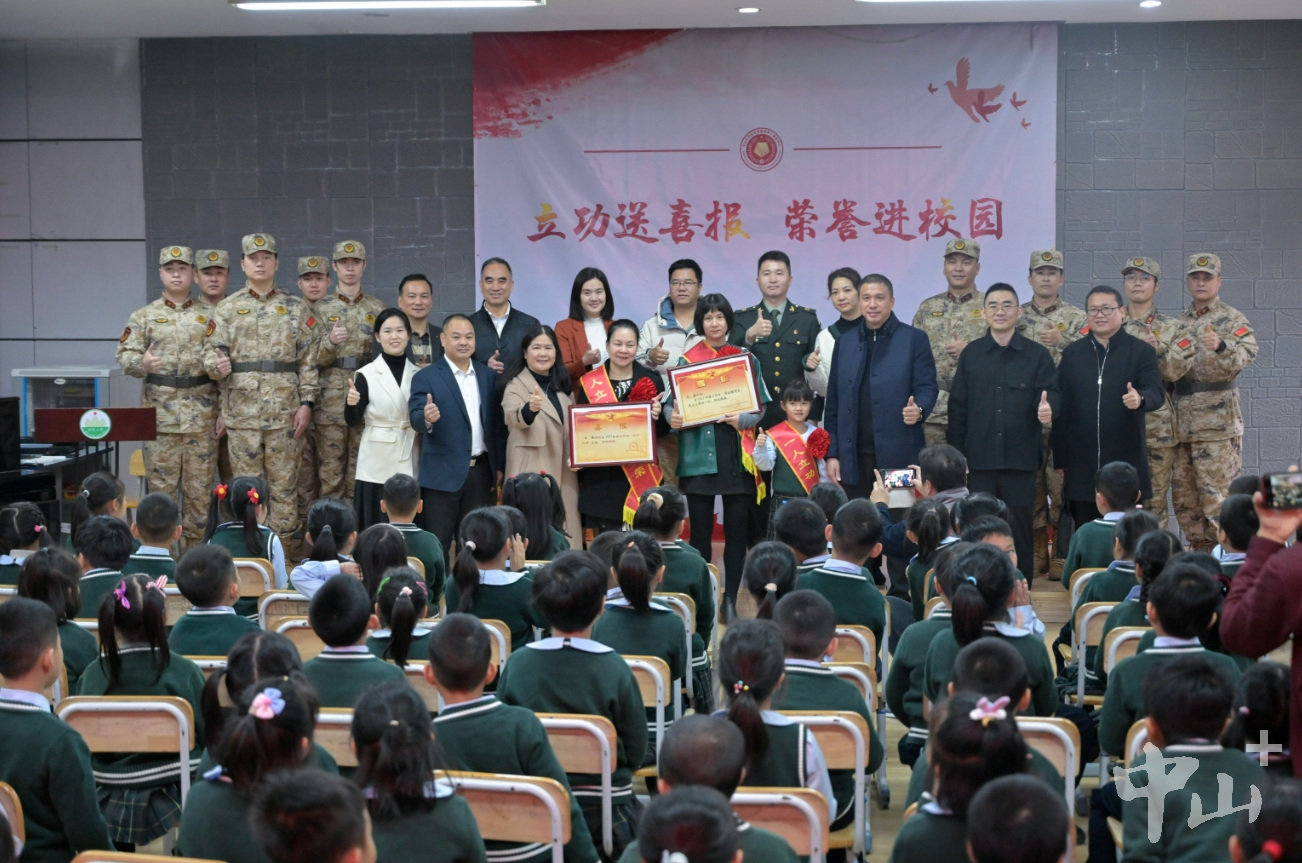 拉橫幅、敲鑼鼓、舞龍獅……2月29日一早,東區(qū)街道竹苑社區(qū)迎來了一支敲鑼打鼓、舞龍舞獅的隊伍,一路喜氣洋洋,熱鬧非凡。游行隊伍將一份立功受獎的榮譽,帶到了榮立三等功的現(xiàn)役軍人孫鍵女兒孫頌雅所在的竹苑小學,熱鬧的場面吸引許多鄉(xiāng)親、商戶等前來圍觀祝賀。 聯(lián)合送喜報,儀式感拉滿 校園內,在讀小學一年級的“軍娃”孫頌雅和她的同學、老師等共同見證了這一榮耀時刻。東區(qū)街道黨工委書記周俊峰將三等功喜報送到孫頌雅一家人手上,市退役軍人事務局黨組成員、副局長陳光林為他們送上慰問金,并為其佩戴光榮綬帶“一人立功,全家光榮”,一家人臉上洋溢著開心且自豪的笑容。  孫頌雅一家人在學校收到立功喜報。記者 易承樂 攝