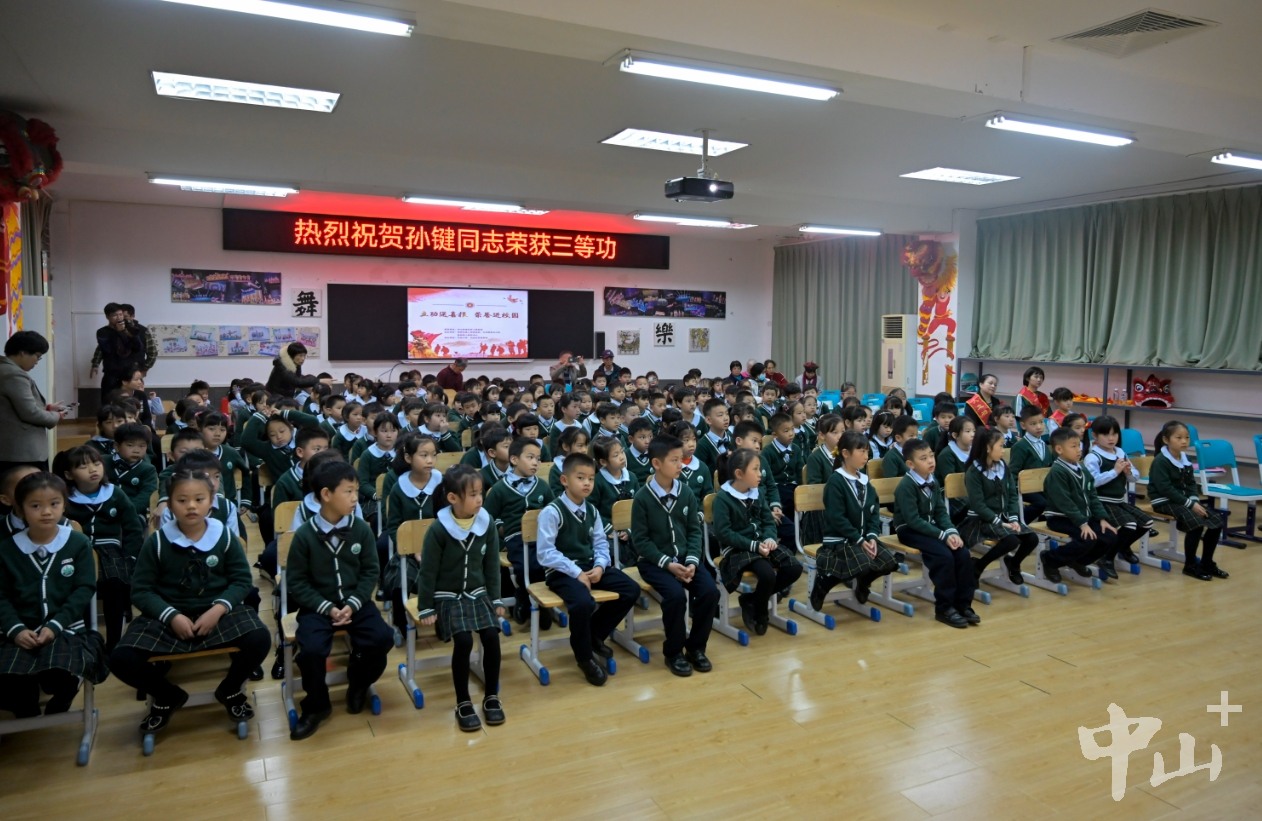 喜報一頭連著軍心士氣,一頭系著軍屬情懷。活動現(xiàn)場,榮立三等功的現(xiàn)役軍人孫鍵通過視頻向女兒說出心里話:“我最親愛的女兒頌雅,爸爸多么想陪伴在你的身邊,每一個節(jié)假日,每一天,看著你慢慢地成長。但是天下雖安,忘戰(zhàn)必危。國無防不立,民無兵不安,爸爸要保家衛(wèi)國。我的女兒,希望你理解和體諒爸爸的不能陪伴。爸爸也曾經是竹苑小學的學生,從這里走出去,走向祖國更需要爸爸的地方……” 據(jù)介紹,2014年起至今,孫鍵在中國人民解放軍某部隊服役,因表現(xiàn)突出榮獲“四有”優(yōu)秀士兵、榮立三等功。因常年在部隊,孫鍵不能像其他孩子的父親那樣給予女兒更多關愛和陪伴,他們只能通過手機交流。 孫鍵的妻子郭麗說:“丈夫從小就想當兵,大學畢業(yè)后他選擇參軍報國,我們一直默默支持他。今天的儀式太隆重了,我平時很少跟女兒講爸爸的工作到底是什么,孩子的性格有點內向,爸爸想讓女兒在學校過得更開心,更開朗一些?!?/p> 開展紅色宣講,愛國主義教育進校園 記者現(xiàn)場看到,活動還邀請了“中國好人”、東區(qū)街道退役軍人紅旗志愿服務隊隊長李克為大家上了一堂生動的愛國主義教育課,并將移動軍旅展覽館帶到校園,通過紅色宣講和軍旅物品展示,把愛國情懷厚植于小朋友們幼小的心靈中。  為孩子們上愛國主義教育課。記者 易承樂 攝