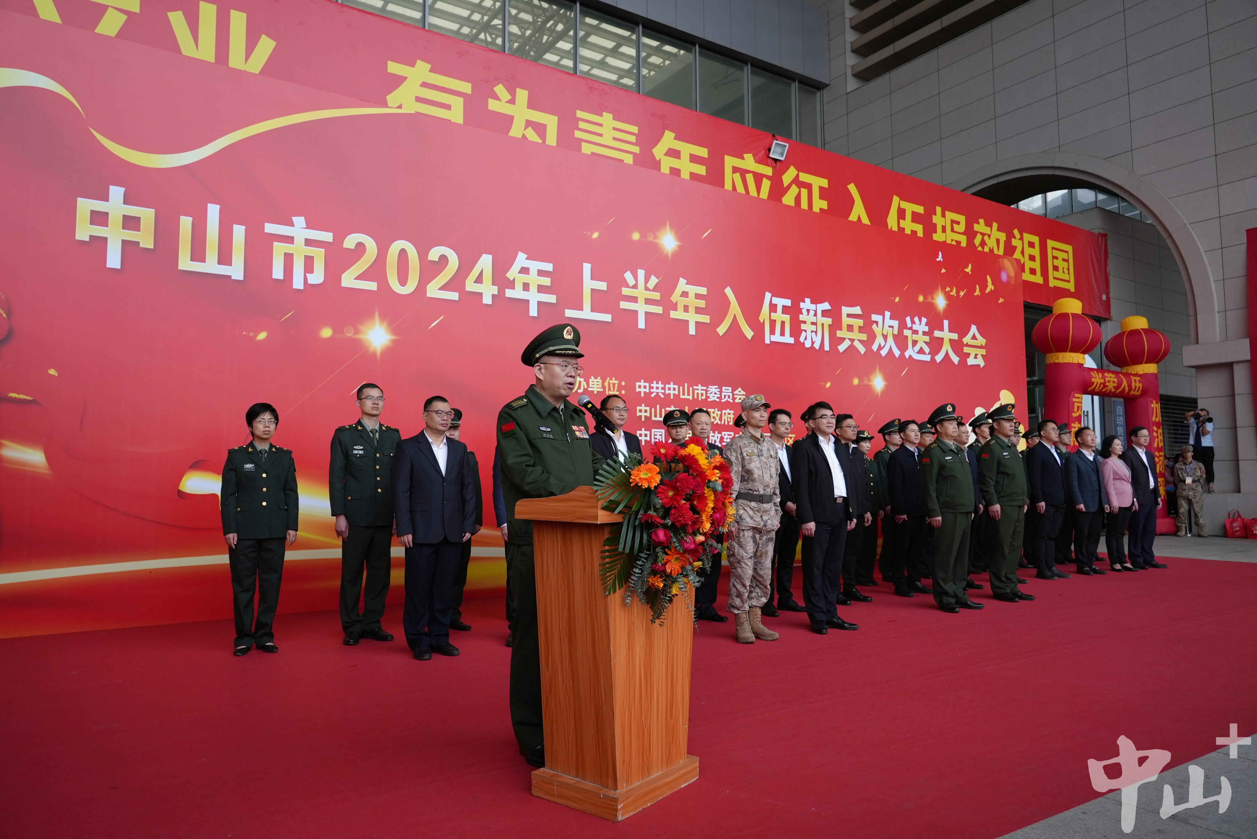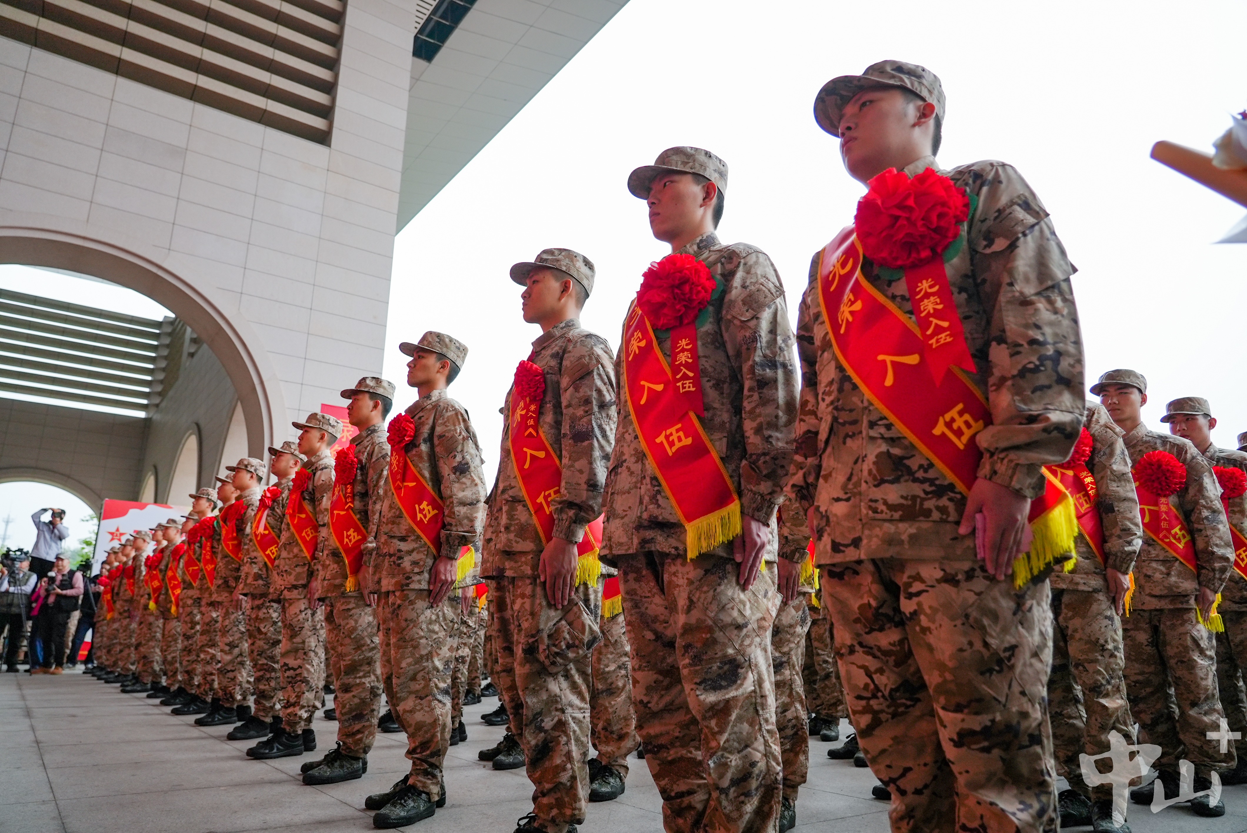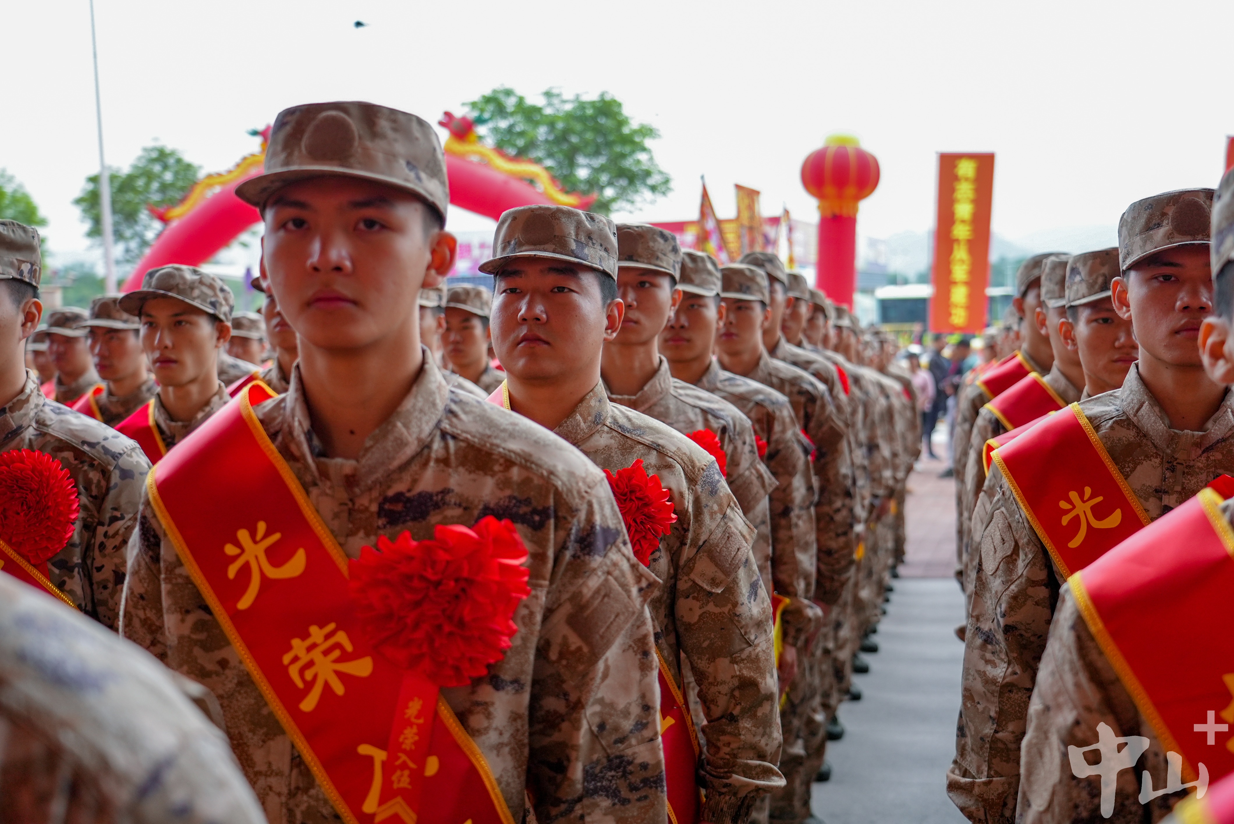 中山市征兵工作領(lǐng)導(dǎo)小組副組長、中山軍分區(qū)大校司令員李云濤,中山市征兵工作領(lǐng)導(dǎo)小組副組長、中山軍分區(qū)大校政治委員朱月明,市征兵辦副主任、市政府副秘書長梁克等出席大會(huì)。 歡送現(xiàn)場(chǎng),新兵們?nèi)盅b整肅,身披“光榮入伍”的紅色綬帶,胸戴紅花,精神抖擻、軍姿挺拔。   新兵們?nèi)盅b整肅,精神抖擻、軍姿挺拔。記者 易承樂 攝