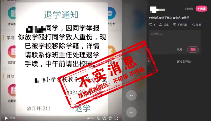 無(wú)獨(dú)有偶,近期重慶酉陽(yáng)縣某小學(xué)一學(xué)生也對(duì)這則謠言進(jìn)行“模仿秀”,在網(wǎng)上惡搞“克隆”出“退學(xué)通知”,并以學(xué)校名義署名落款。相關(guān)謠言在網(wǎng)上傳播后引發(fā)議論。目前,這則謠言已被刪除,學(xué)校對(duì)該學(xué)生進(jìn)行了批評(píng)教育。