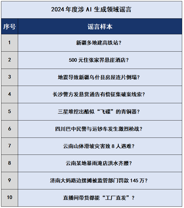 2024年初,“新疆多地建高鐵站”虛假短視頻在網(wǎng)上流傳,此類視頻由軟件智能合成,用戶只需使用指定視頻模板、手動替換涉本人家鄉(xiāng)相關(guān)地點的文字即可生成新視頻,利用人們對家鄉(xiāng)基礎(chǔ)設(shè)施建設(shè)情況的關(guān)注而大肆傳播,誤導(dǎo)公眾。還有個別網(wǎng)民為獲取流量和不當利益,利用AI軟件蓄意歪曲“交警請占道停留的運鈔車駛離”的事實,編造謠言“四川巴中民警與運鈔車發(fā)生激烈槍戰(zhàn)”,造成公眾恐慌和誤解。此外,謠言“濟南大媽路邊擺攤被監(jiān)管部門罰款145萬”實為AI工具生成的虛假文章,大肆消費公眾的同情心博取眼球,引發(fā)大范圍傳播,造成不良社會影響,相關(guān)違法人員被公安機關(guān)依法行政拘留。“云南山體滑坡災(zāi)害致8人遇難”“地震導(dǎo)致新疆烏什縣房屋連片倒塌”“云南某地暴雨淹店洪水齊腰”等謠言則純屬子虛烏有,均為AI特效炮制的虛假視頻,利用公眾對災(zāi)難事件的重視編造傷亡情況,制造恐慌情緒,擾亂社會秩序。