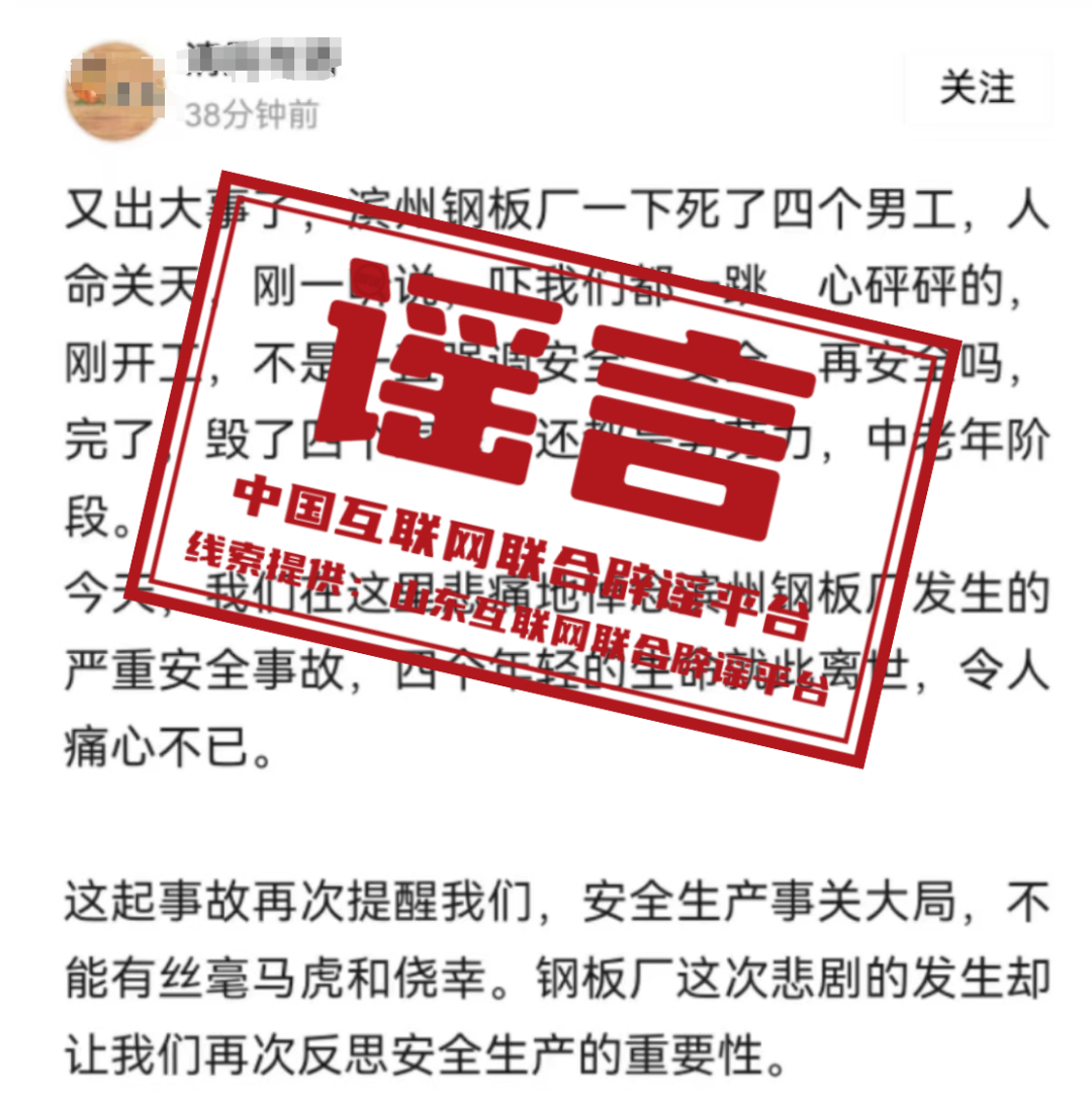 謠 言 山東濱州鋼板廠發(fā)生安全事故死了四個(gè)工人?
