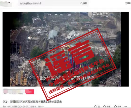 詳情:4月7日、8日,新疆阿克蘇地區(qū)拜城縣先后發(fā)生5.4、5.1級地震。震中位于無人區(qū),目前暫未收到人員傷亡或財產損失報告,當地通訊、供電、交通正常。但有部分自媒體為博眼球、蹭流量,利用AI智能技術等手段拼湊網絡舊圖,發(fā)布拜城地震不實圖文、音視頻等信息,嚴重誤導網民。阿克蘇地區(qū)互聯(lián)網信息辦公室提醒,對在網上蓄意編造、傳播散布謠言,擾亂公共秩序等違法行為,網信部門將會同公安機關依法嚴厲打擊。(來源:“新疆網絡辟謠”微信公眾號)