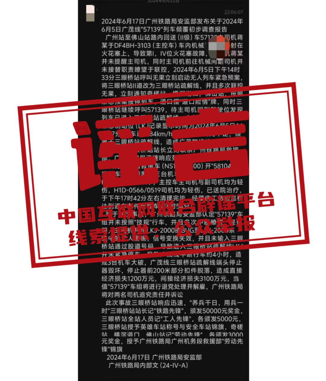 辟 謠 網(wǎng)傳“廣州鐵路局安監(jiān)部2024年6月5日廣茂線57139列車傾覆初步調(diào)查報(bào)告”為虛假信息
