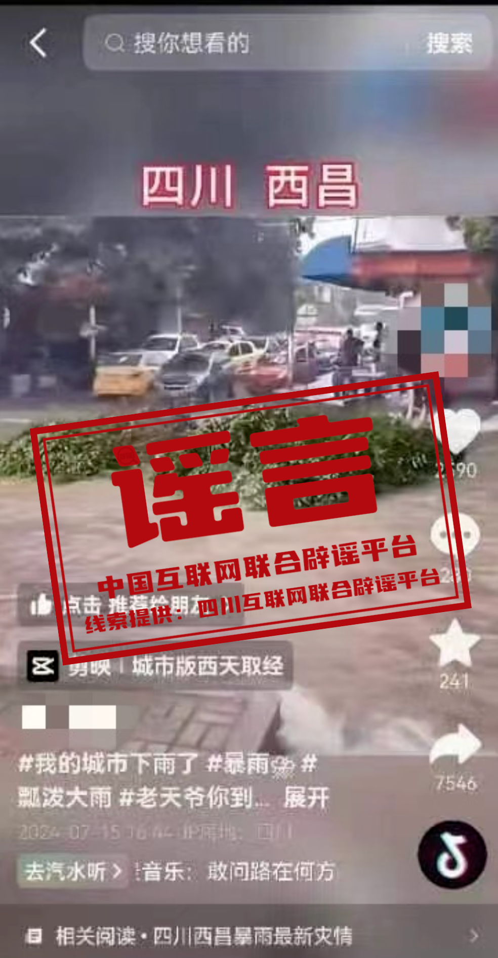 近日,有網(wǎng)民發(fā)布一條視頻,顯示兩人利用被吹斷的大樹(shù)枝在街道上乘汛漂流,并在視頻上方標(biāo)注了“四川西昌”的字樣,引發(fā)網(wǎng)民關(guān)注。經(jīng)調(diào)查,該視頻系網(wǎng)民蔡某為博眼球、吸流量,利用短視頻編輯軟件上的模板剪輯而成,并在短視頻平臺(tái)進(jìn)行傳播,造成不良社會(huì)影響。當(dāng)?shù)毓矙C(jī)關(guān)依法對(duì)其進(jìn)行處罰,并已責(zé)令其刪除謠言信息。(來(lái)源:四川互聯(lián)網(wǎng)舉報(bào)辟謠平臺(tái))