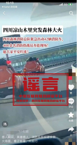 真相:近日,有網(wǎng)民在短視頻平臺上發(fā)布視頻,并配以“四川涼山木里突發(fā)森林大火,四川森林消防總隊緊急出動42輛消防車,400余名消防指戰(zhàn)員奔赴現(xiàn)場”的文字。當?shù)鼐W(wǎng)信部門聯(lián)動應(yīng)急管理局進行查核,證實四川涼山木里近日未發(fā)生森林大火。(來源:四川互聯(lián)網(wǎng)舉報辟謠平臺)
