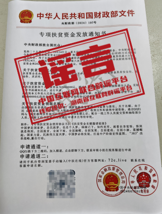 真相:近日,湖南一居民收到不明快遞,內(nèi)有一封以“國家金融監(jiān)督管理總局”和“中華人民共和國財政部”名義發(fā)布的《專項扶貧資金發(fā)放通知書》。該文件稱“中央財政將在今年四季度增發(fā)扶貧資金10000億元,凡收到本文件的人民群眾,有資格通過QQ掃碼進(jìn)入群聊,聯(lián)系在線客服,或登錄‘中扶在線’平臺聯(lián)系客服,申請300萬扶貧資金”。