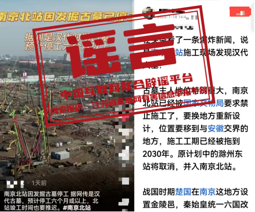 真相:近日,有網(wǎng)民在網(wǎng)絡(luò)平臺發(fā)帖稱,南京北站因挖到古墓,“已經(jīng)被國家文物局要求禁止施工了”“預計停工六個月或以上”“施工工期已經(jīng)被拖到2030年”等。經(jīng)江蘇省互聯(lián)網(wǎng)辟謠平臺與省文物部門和屬地核實,目前沒有收到國家文物局關(guān)于“南京北站禁止施工”的有關(guān)通知,南京北站除個別涉及考古發(fā)掘作業(yè)區(qū)域外,其他施工作業(yè)均按計劃正常有序推進,網(wǎng)傳信息系謠言。(來源:江蘇省互聯(lián)網(wǎng)辟謠平臺、“南京網(wǎng)絡(luò)辟謠”微信公眾號)