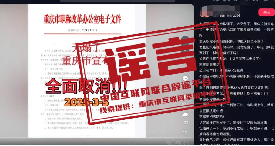 真相:近日,有網(wǎng)民在互聯(lián)網(wǎng)平臺發(fā)布消息稱“重慶市宣布,申請評審的要求取消了很多條條框框,職稱申請不看前置職稱,全日制本科十年直接認定副高,不需要中級職稱”,引發(fā)關(guān)注。經(jīng)核實,網(wǎng)傳信息系謠言。職稱評審均需逐級晉升,取得上一級職稱并滿足相應學歷資歷條件后方可晉升高一級職稱。目前重慶市除特殊人才、博士后等3個針對特定對象的職稱申報綠色通道外,正常申報通道均需逐級晉升。網(wǎng)傳文件是網(wǎng)民通過P圖軟件編輯而成,試圖吸引不明真相的群眾咨詢,借機推銷職稱代辦服務,收取高額費用。目前,謠言線索已轉(zhuǎn)交公安機關(guān)進一步調(diào)查處置。(來源:“重慶辟謠”微信公眾號)