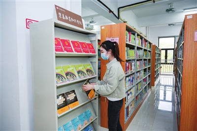 中山市桂山中學(xué)禁毒教育知識(shí)專柜前,工作人員正在整理禁毒圖書。 本報(bào)記者 易承樂 攝